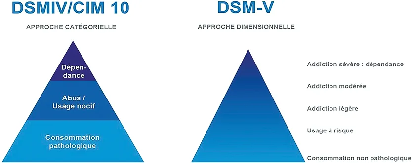 Cette maladie chronique se caractérise par la perte de contrôle de l’usage d’une substance ou d’un comportement qui engendre des conséquences néfastes pour l’individu concerné. L’addiction est définie par les classifications internationales des maladies ; le DSM V de l’Association Américaine de Psychiatrie (8) et la CIM 11 de l’Organisation Mondiale de la Santé (9) avec des approches diagnostiques légèrement différentes du trouble (Annexe 1). En effet, La CIM 11 propose une approche catégorielle et ontologique, permettant de différencier les différents mésusages d’alcool, puis avec des mécanismes de dépendances, elle est principalement utilisée en clinique pour le codage des maladies. Le DSM V propose une approche dimensionnelle qui prend en compte, certes les mécanismes de dépendance, mais également les conséquences personnelles et interpersonnelles de l’usage. Cette dernière classification est moins stigmatisante pour l’individu, plus réaliste, elle est également utilisée dans le cadre de la recherche.