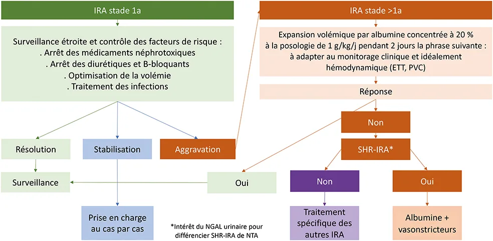 La reconnaissance précoce et le traitement de l’IRA sont importants car ils permettent d’en améliorer le pronostic. Ainsi, la prise en charge doit débuter dès que le diagnostic d’IRA est posé. En premier lieu, les agents néphrotoxiques, notamment les anti-inflammatoires non stéroïdiens, de même que les traitements vasodilatateurs et les bêta-bloquants doivent être arrêtés. En parallèle, le traitement diurétique doit être interrompu. Une infection doit être recherchée et traitée. Le stade 1A de l’IRA (créatinine sérique < 15 mg/l – 132 μmol/l) est le plus souvent dû à insuffisance rénale pré-rénale en lien avec une hypovolémie efficace isolée et plus de 90 % des cas se résolvent avec la seule gestion de ces facteurs de risque. En comparaison, seulement 50 % des IRA des patients atteints de stade 1B se résolvent sans expansion volémique (2, 24). Ainsi, les patients qui présentent une IRA de stade au moins égal à 1B doivent, en plus des mesures initiales, bénéficier d’une expansion volémique par de l’albumine concentrée à 20 % à la posologie de 1 g/kg/j pendant deux jours. Cette posologie standardisée d’albumine pourrait ne pas être adaptée à la situation du patient (patient avec cardiomyopathie cirrhotique ou ayant déjà été optimisé sur le plan volémique). Cette prescription devrait, idéalement, être confrontée aux données d’évaluation hémodynamiques cliniques mais aussi échocardiographiques ou de la pression veineuse centrale lorsque leur mesures est possible. Cette étape d’optimisation volémique est importante pour exclure une IRA pré-rénale sur hypovolémie efficace seule et est nécessaire avant de poser un diagnostic de SHR–IRA (10). Si la fonction rénale ne s’améliore pas et si les patients satisfont aux critères diagnostiques du SHR–IRA, il convient d’initier un traitement par vasoconstricteurs en association avec de l’albumine (10, 24) (figure 2). Les vasoconstricteurs splanchniques sont responsables d’une diminution du débit portal, et par conséquent de la pression portale, en parallèle d’une augmentation du volume sanguin artériel systémique efficace entrainant une augmentation du débit sanguin rénal et de la pression artérielle moyenne (PAM). Une augmentation de la PAM après l’introduction d’un traitement vasoconstricteur est prédictif de la réversibilité du SHR-IRA (33) et est un paramètre clinique important à prendre en compte après instauration du traitement. Les vasoconstricteurs les plus utilisés dans le traitement du SHR-AKI sont la terlipressine, la norépinéphrine et la combinaison d’octréotide et de midodrine.