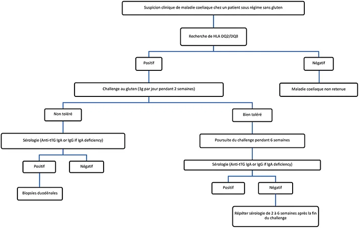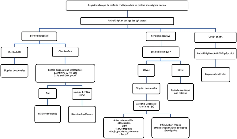 Chez un patient avec régime normal, l’étape initiale consiste à rechercher des AC anti-tTG IgA. Le dosage des IgA totaux doit y être associé afin d’exclure le risque de faux négatif induit par un déficit en IgA. Dans ce cas, la présence d’anti-tTG IgG et/ou anti-DPG IgG doit être recherchée.