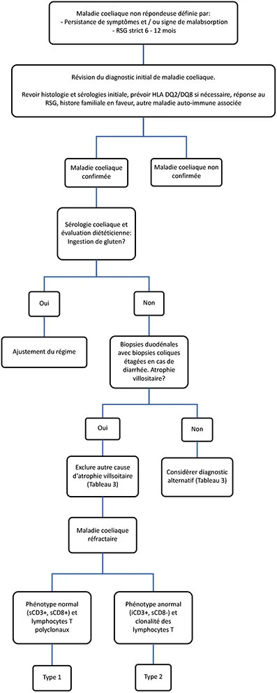 La maladie cœliaque réfractaire est définie comme la persistance de symptômes et/ou de signe de malabsorption avec persistance d’une AV malgré un RSG strict depuis 6 à 12 mois (27). Avant d’en établir le diagnostic, les autres causes d’AV doivent être exclues (cf. Tableau 3). Cette complication est rare et surviendrait chez moins de 1 % des patients atteints de MC (28). La stratégie d’exploration des patients avec des symptômes ou signes évocateurs d’une maladie cœliaque réfractaire est résumée dans la figure 3. La maladie cœliaque réfractaire est divisée en deux sous types selon le phénotype de marqueurs de surface (CD3 et CD8) des lymphocytes T intraépithéliaux (LIE) duodénaux identifié par immunohistochimie ou cytométrie en flux et la présence d’un réarrangement monoclonal du récepteur des lymphocytes T (TCR). La maladie cœliaque réfractaire de type 1 est caractérisée par une population polyclonale et un phénotype CD3/CD8 normal avec expression de surface de ces 2 marqueurs. La prise en charge se base sur une réévaluation du RSG et une élimination des aliments transformés. Malgré l’absence d’étude contrôlée contre placebo, les traitements proposés sont le budésonide en open-capsule, la prednisone, les immunomodulateurs et certaines biothérapies. La MC réfractaire de type 2 est caractérisée par la détection d’un réarrangement clonal lymphocytaire T, une absence du marqueur CD8 et une présence aberrante de CD3 intracytoplasmique des LIE. Elle est assimilée à un lymphome intra épithélial et présente un mauvais pronostic avec un risque de mortalité élevé et de transformation en lymphome T de haut grade (EATL). Les traitements proposés sont le budésonide open-capsule, la cladribine (ou fludarabine) et l’autogreffe de moelle (29). Des traitements utilisant des anticorps anti IL15 ou des inhibiteurs Jak peuvent être proposés après prise en charge dans un centre référent.