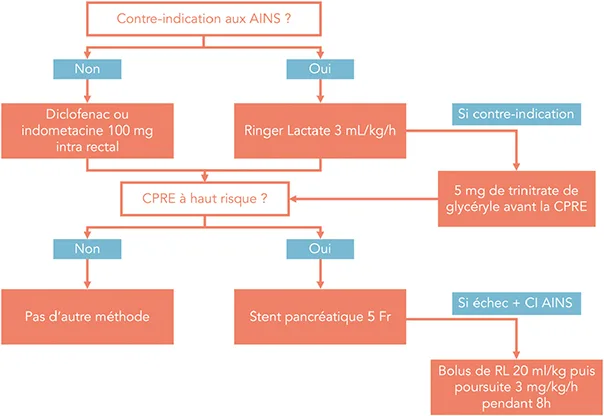 Plusieurs techniques sont donc efficaces pour diminuer le risque de pancréatite aiguë post-CPRE. Compte tenu de son faible coût, de sa facilité d’utilisation, de son efficacité et du faible nombre de contre-indication, le suppositoire d’AINS est le traitement, presque universel, à proposer en première intention. Il ne doit pas être réservé aux patients à haut risque, et doit être proposé même en cas de papille déjà sphinctérotomisée. Cette prévention doit également être proposée en cas d’ampullectomie. Malgré l’absence de données à propos des biopsies de papille, le faible coût et la bonne tolérance du traitement permettent de considérer également l’administration d’un suppositoire d’AINS dans cette situation.
