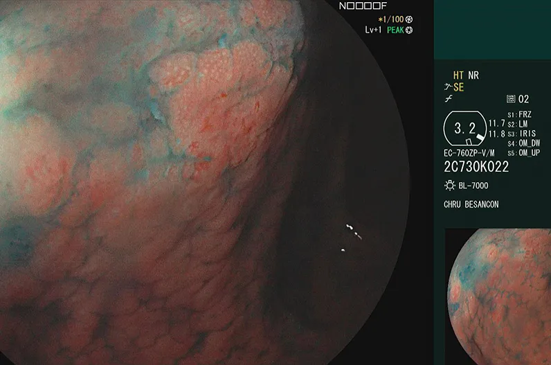 Figure 2 : Lésion plane sans limites nettes de pit pattern atypique chez un patient aux antécédents de RCH ancienne pancolique avec CSP associée (histologie : dysplasie de bas grade). Image CHU Besançon