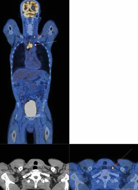 Figure 2 : Patient de 68 ans présentant une dysphagie, une dénutrition, une altération de l’état général. L’endoscopie œsogastroduodénale retrouve une formation tumorale entre 25 et 35 cm des arcades dentaires, dont l’analyse anatompathologique révèle un carcinome épidermoïde. La TEP au FDG met en évidence la lésion œsophagienne hypermétabolique (flèche blanche) et une adénopathie hypermétabolique sus claviculaire gauche (flèche rouge). Le patient bénéficie d’une chimiothérapie 5FU-Cisplatine.