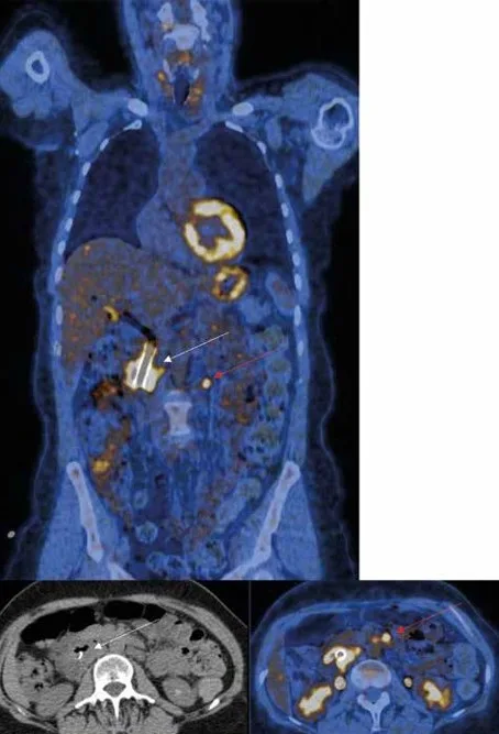 Figure 3 : Patient de 72 ans présentant un adénocarcinome de la tête du pancréas. La TEP réalisée dans le cadre du bilan initial retrouve la masse tumorale pancréatique hypermétabolique intense et une adénopathie hypermétabolique para aortique (flèche rouge).