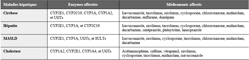 Tableau 2 : Enzymes et métabolisme médicamenteux affectés en fonction des pathologieshépatiques (8)