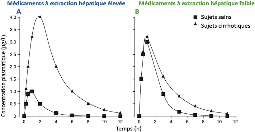 A. Médicaments à extraction hépatique élevée : Sujet sain (carrés noirs) : Les concentrations plasmatiques atteignent un pic plus faible, et le médicament est éliminé Sujet avec cirrhose du foie (triangles noirs) : La concentration plasmatique maximale est plus élevée, la biodisponibilité est augmentée, et l’élimination est ralentie.