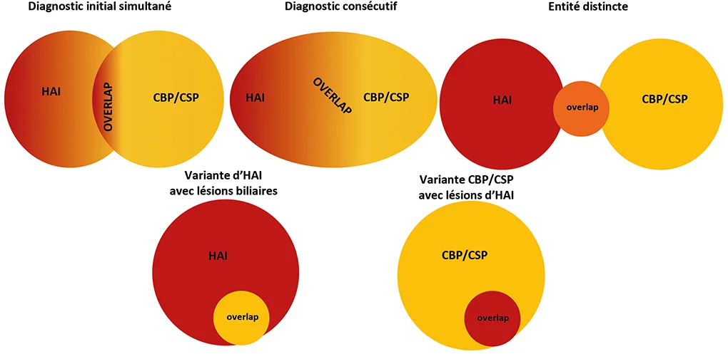 Syndrome de chevauchement ; hépatite auto-immune ; cholangite biliaire primitive ; cholangite sclérosante primitive