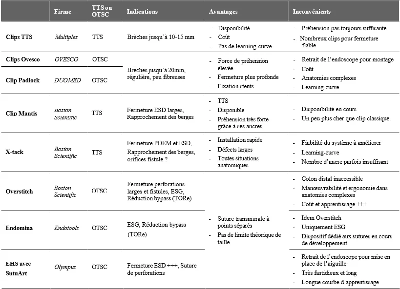 Tableau 1 : Principaux dispositifs de fermeture et de suture endoscopique : principales caractéristiques