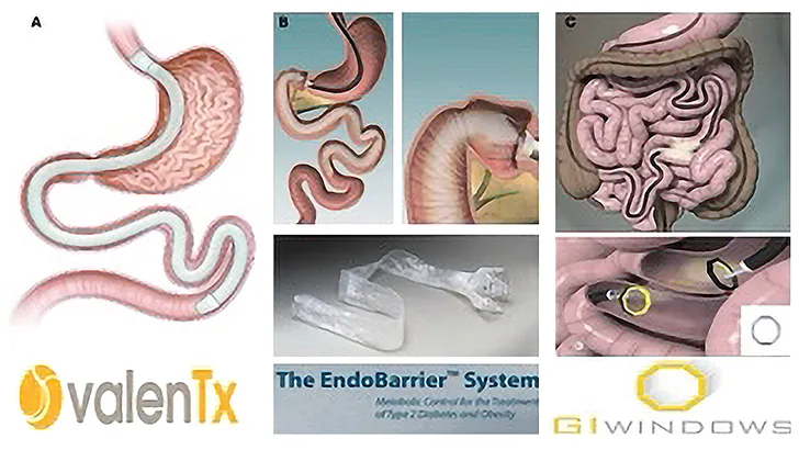 A/ Sleeve oeso-gastro-duodénale, Valent-X ; B/ Jupe duodénojéjunale Endobarrier ; C/ Dispositif IMAS (aimants jéjuno-iléaux)