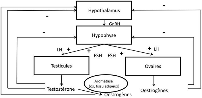 À l’état physiologique, la sécrétion pulsatile hypothalamique de GnRH entraîne chez l’homme et la femme la sécrétion hypophysaire de FSH et LH. Chez l’homme, la LH agit sur les cellules de Leydig entraînant une synthèse de testostérone ; la FSH agit sur les tubules séminifères et favorise la spermatogénèse ; la testostérone, par un rétrocontrôle négatif, inhibe la sécrétion de GnRH et de FSH/LH. Par ailleurs, la testostérone est transformée en estrogènes par une enzyme appeléearomatase, présente dans l’os et le tissu adipeux. Chez la femme, la FSH et la LH ont pour cible les ovaires et contrôlent le développement folliculaire et l’ovulation, ainsi que la production d’estrogènes, de progestérone, et d’inhibine, lesquelles exercent un rétrocontrôle négatif sur l’hypothalamus et l’hypophyse.