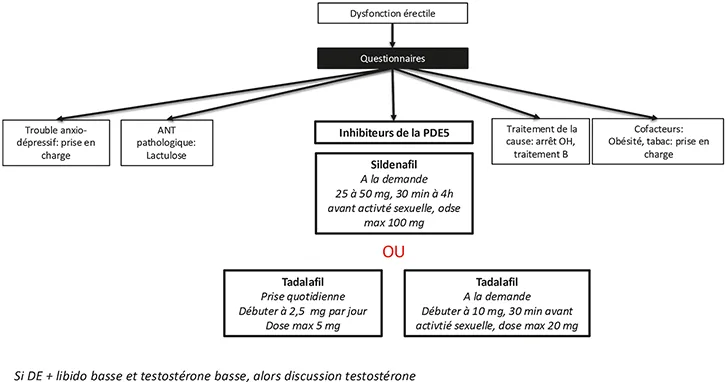 Chez l’homme, après avoir donné tous les auto-questionnaires, la prise en charge de la DS repose sur les inhibiteurs de la PDE5 et sur la prise en charge des facteurs associés ou aggravants (surpoids, tabac, alcool, traitement de la cause de la maladie hépatique) Abréviations : ANT, animal naming test ; PDE5, phosphodiestérase de type 5 ; OH, alcool ; B, virus de l’hépatite B