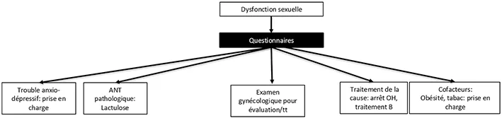 Chez la femme, après avoir donné tous les auto-questionnaires, la prise en charge de la DS sur la prise en charge des facteurs associés ou aggravants (surpoids, tabac, alcool, traitement de la cause de la maladie hépatique), et sur le traitement de facteurs locaux (candidoses, troubles de la statique pelvienne). Le sujet est tellement peu étudié qu’aucune recommandation ne peut être formulée